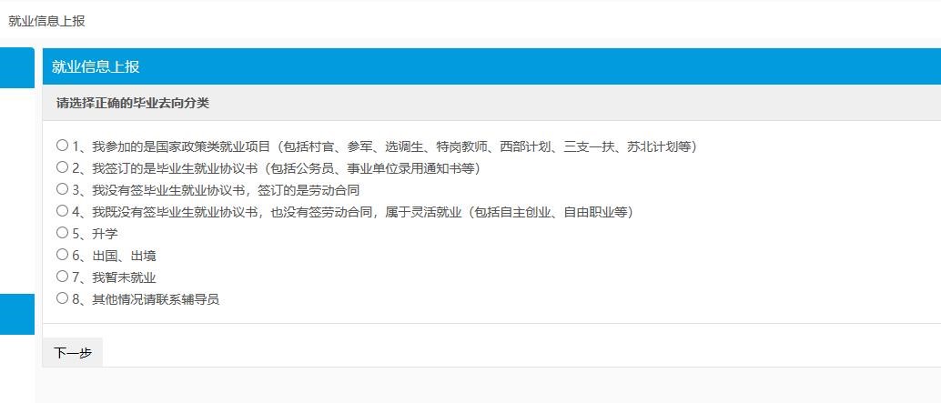 2.点击“就业信息上报”。根据实际就业情况进行选择,然后逐一点击“下一步”。