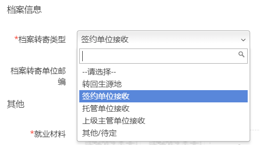 3、已就业档案暂放学校:档案转寄类型请选择“其他/待定”其他信息不用填写;