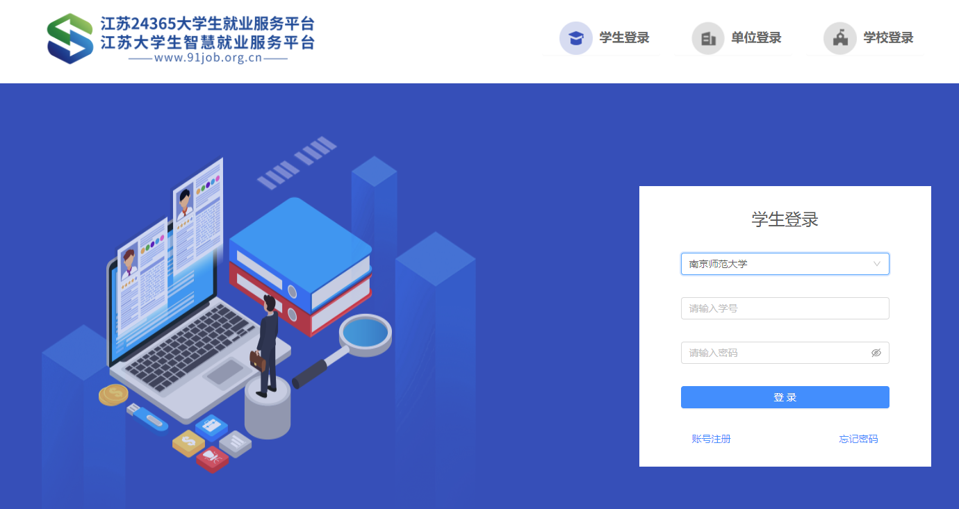 1.登陆http://www.91job.org.cn/user/student。选择学校,输入学号和密码登录就业管理系统。密码若遗忘,请咨询辅导员。